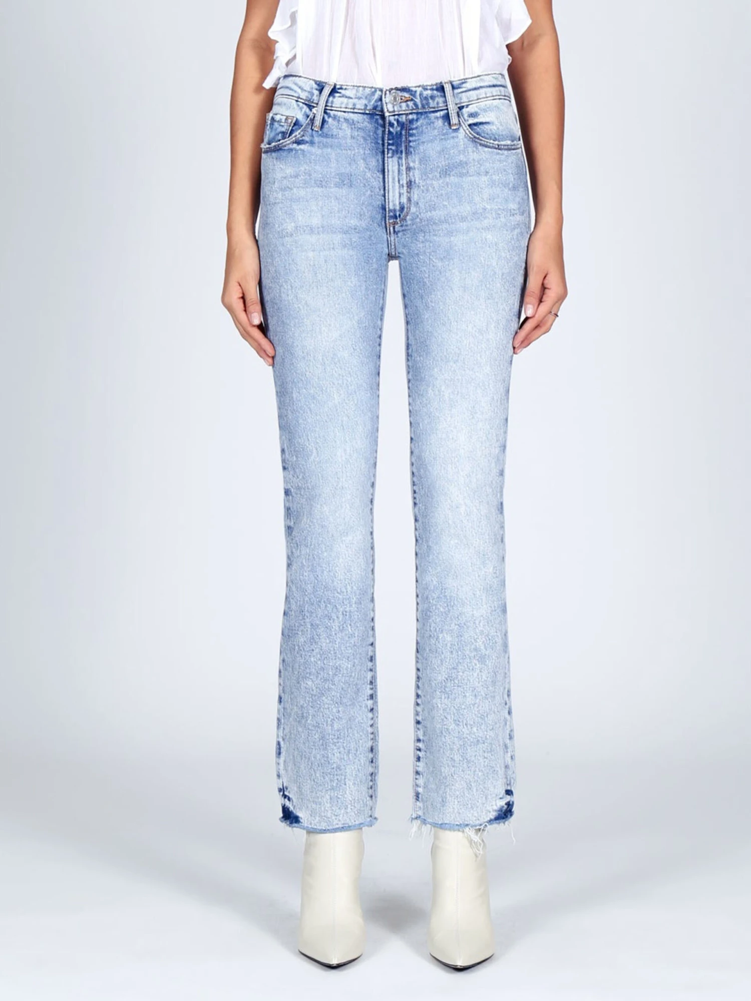 Best jeans you’ve ever had. Our Bardot Straight Fray has a slim straight leg fit with a 9-inch rise. The raw hem adds for an edgy, undone take. A vintage 80s slight acid wash light blue jeans