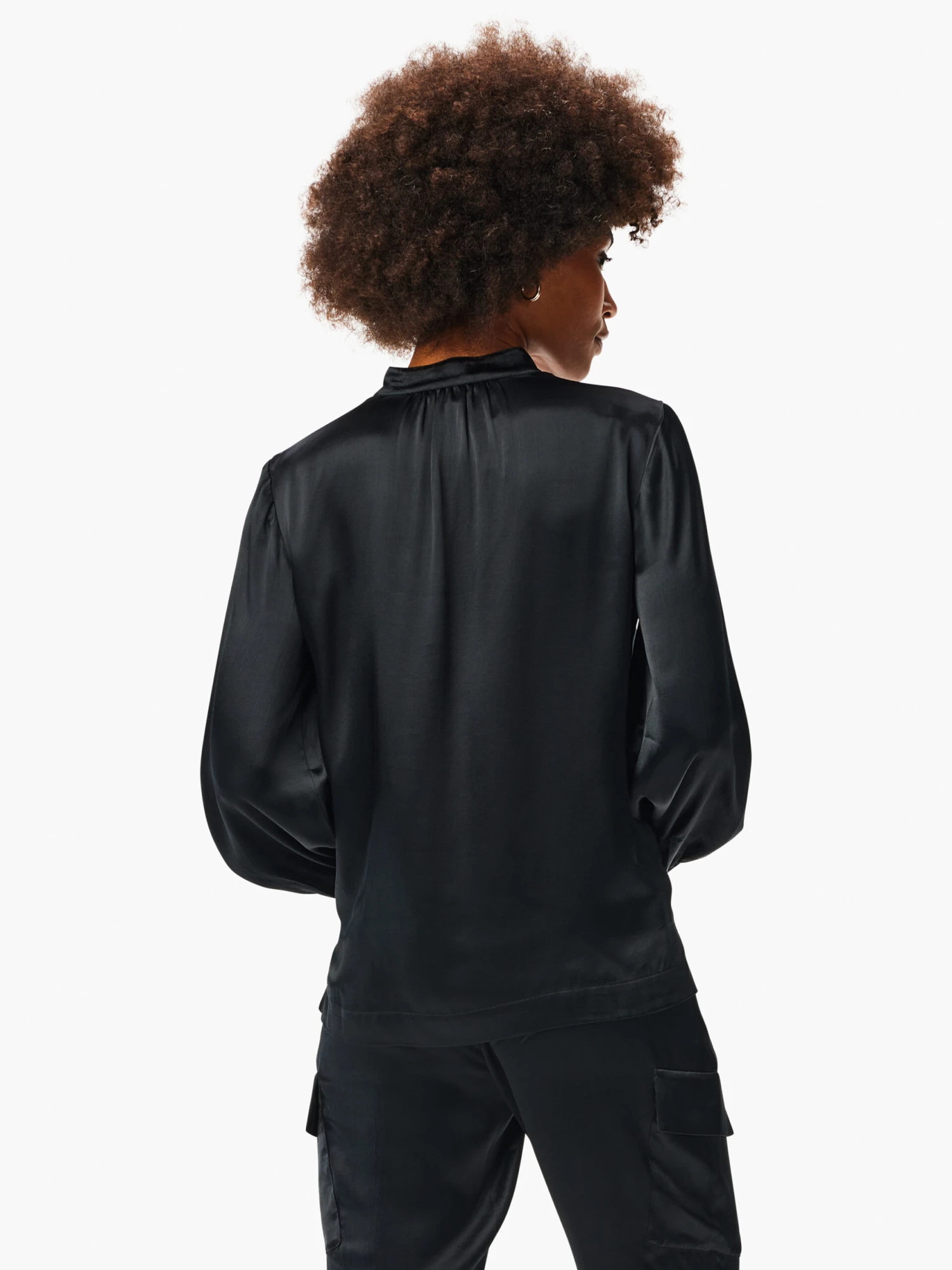 This elegant neutral top is instant impact dressing, whether you’re wearing it with the matching skirt as part of a set or creating a style all your own. The stand collar adds some sophistication and breaks up the neutral sheen while the relaxed fit and extra length gives it some drape and creates conversation with the other pieces of your outfit.