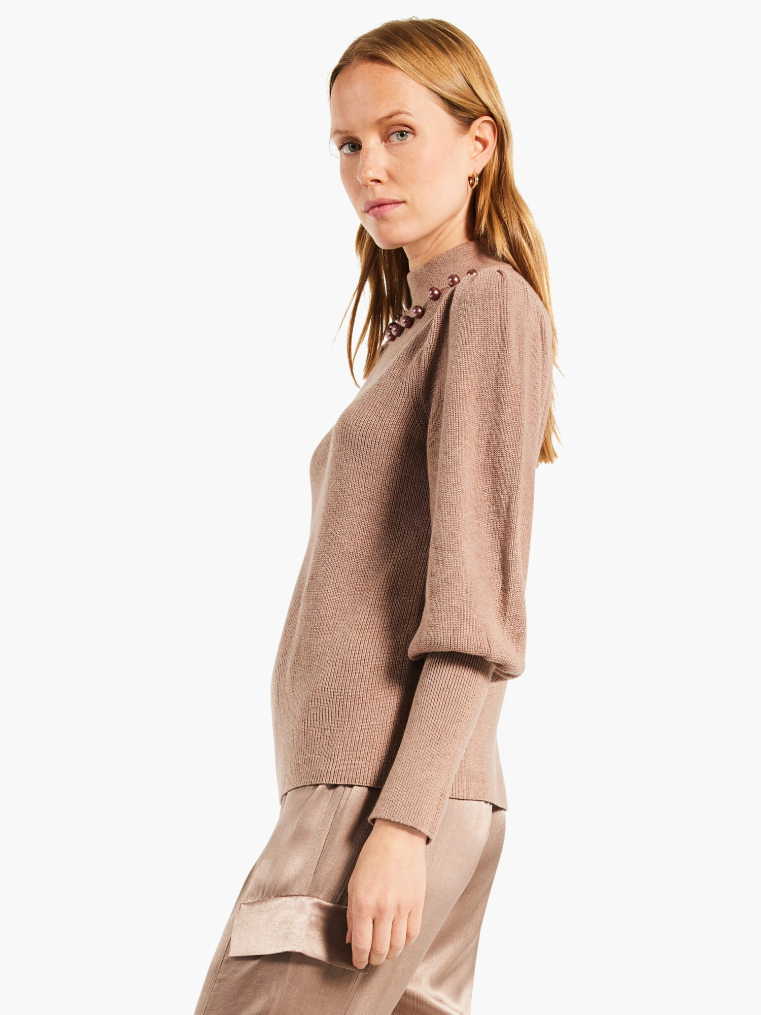 The sun may be setting, but your fun has only just begun. Designed with entertaining in mind, this solid block of color relies on its details to make the difference: details like the extra-long cuff, the mock neck rib collar with placed beads that draw the eye, and the pleated gathering at the top of the sleeve. A midweight fit with a hem that sits at the hip.